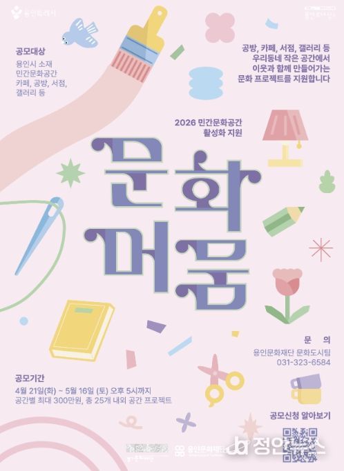 정안뉴스 안정주 기자 | 용인문화재단은 오는 5월 16일까지 ‘민간문화공간 활성화 지원사업 '문화머뭄'’의 참여 공간을 모집한다고 밝혔다. 지난해 25개소 공간에서 203회의 프로그램을 운영하며 2,101명의 시민 참여를 이끌어낸 ‘문화머뭄’ 사업은 올해 재단 자체 재원을 매칭하여 총 25개소의 민간문화공간을 선정하고, 공간별 최대 300만 원까지 프로젝트 운영비를 지원할 예정이다.