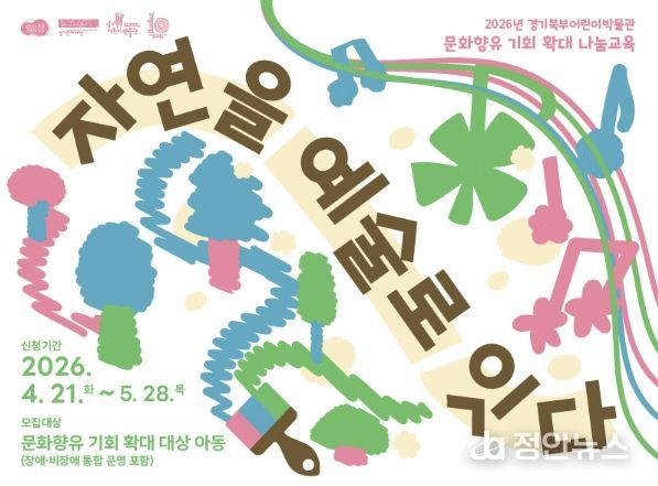 '자연을 예술로 잇다' 프로그램은 문화향유 기회 확대 대상 아동을 대상으로, 해당 아동단체들의 신청을 통해 6월까지 운영된다. 신청기간은 2026년 4월 21일부터 5월 28일까지이며, 장애아동뿐만 아니라 장애·비장애아동 통합신청도 가능하다.