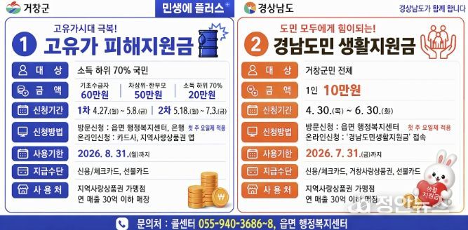 정안뉴스 김재홍 기자 | 거창군은 장기화되고 있는 고유가와 경제침체에 어려움을 겪는 군민들의 생활안정을 위해 ‘고유가 피해지원금’과 ‘경남도민 생활지원금’을 지급한다.