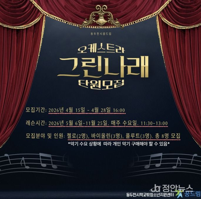 정안뉴스 안정주 기자 | 동두천시학교밖청소년지원센터는 2026년을 맞아 학교 밖 청소년을 대상으로 ‘그린나래 오케스트라’ 신규 단원을 모집한다고 밝혔다.