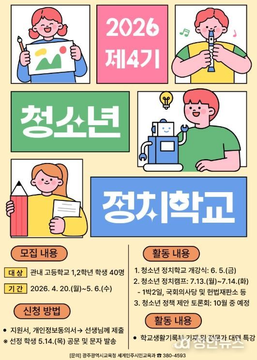 정안뉴스 안정주 기자 | 광주시교육청은 청소년의 정치참여 역량을 키우기 위해 ‘제4기 청소년 정치학교’ 참가자를 모집한다.