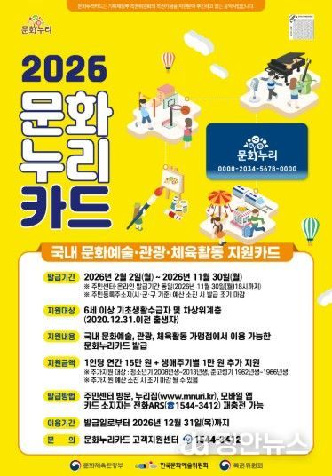 한편, 문화누리카드는 각 동 행정복지센터, 문화누리카드 누리집, 모바일 앱 등을 통해 오는 11월 30일까지 선착순 발급되며, 12월 31일까지 사용하지 않으면 자동 소멸한다.