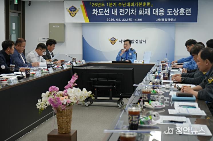 정안뉴스 김재홍 기자 | 사천해양경찰서는 23일 도선 내 전기차 화재 상황을 대비하여 선제적 해양사고 예방과 신속한 구조 대응체계 확립을 위한 수난대비기본훈련을 실시했다고 밝혔다.