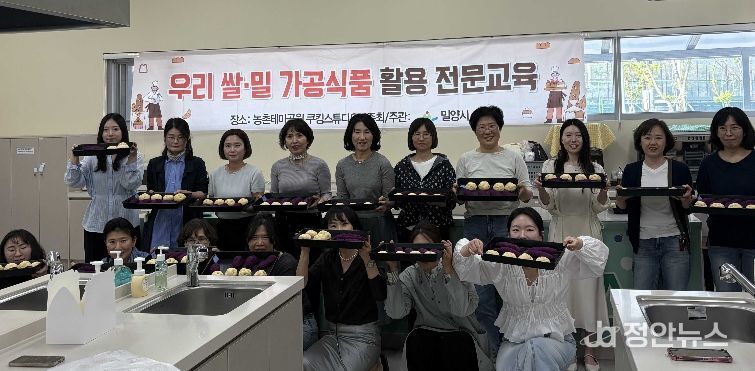 정안뉴스 김재홍 기자 | 경남 밀양시는 지난 21일과 23일 이틀간 선샤인 밀양 테마파크에서 우리 쌀·밀의 소비 확대와 건강한 식문화 정착을 위해 관내 학교 초·중·고등학교 영양교사 37명을 대상으로 ‘우리 쌀·밀 가공식품 활용 전문교육’을 실시했다.