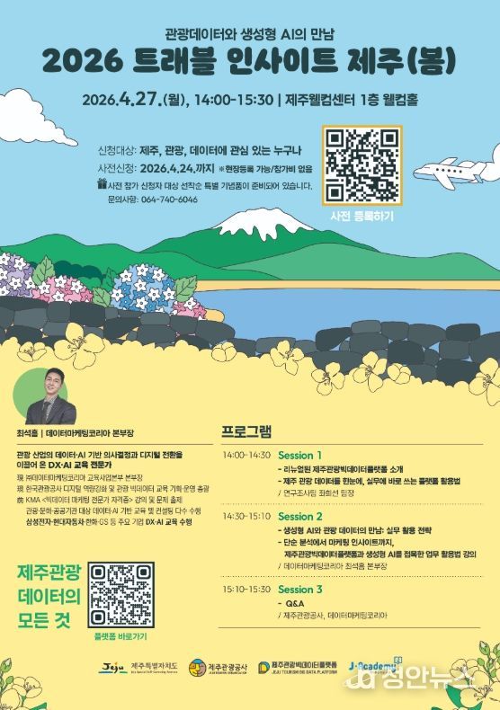 정안뉴스 안정주 기자 | 제주특별자치도와 제주관광공사(사장 고승철)는 오는 27일 제주웰컴센터에서 관광사업체, 공공기관, 학계 등 관광과 데이터에 관심 있는 분들을 대상으로 데이터 기반 의사결정을 지원하기 위한 ‘2026 트래블 인사이트 제주(봄)’ 세미나를 개최한다고 23일 밝혔다. 이번 세미나에선 새롭게 개편한 제주관광 빅데이터 플랫폼(data.ijto.or.kr)의 활용 방안을 소개하고, 생성형 인공지능(AI)과 관광데이터를 결합한 실무 활용 전략을 공유한다.