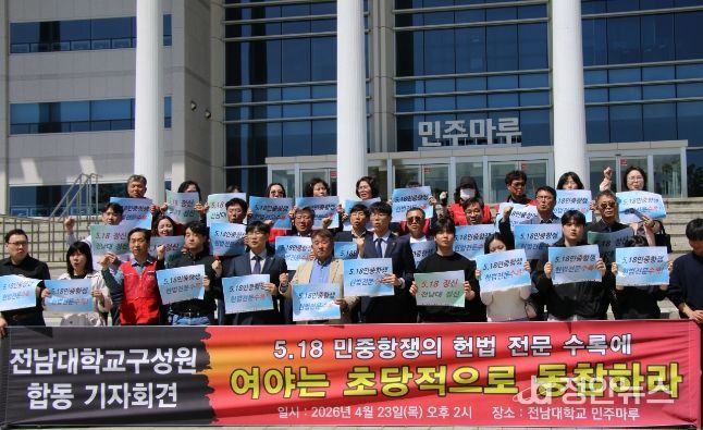 23일 전남대학교에 따르면, 전남대학교 구성원단체(교수·학생·교직원·졸업생)는 이날 오후 2시 전남대학교 민주마루 앞에서 '5·18 민중항쟁의 헌법 전문 수록에 여야는 초당적으로 동참하라'는 공동 기자회견을 개최했다.