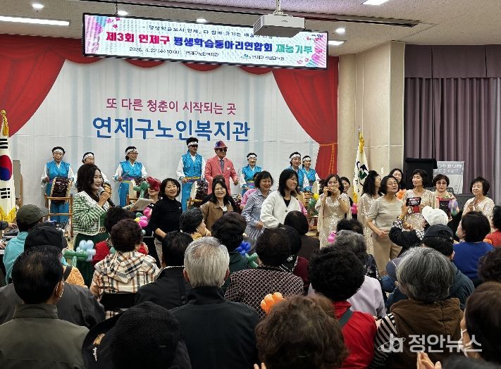 정안뉴스 안정주 기자 | 연제구는 지난 4월 22일 연제구노인복지관에서 지역 어르신 70여 명이 참석한 가운데, 동아리연합회(회장 이경희) 주관으로 동아리 공연 및 학습체험 재능기부 행사를 개최했다.