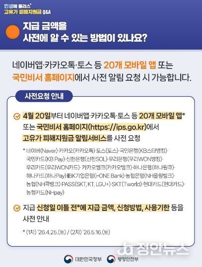 알림 서비스는 네이버, 카카오톡, 토스, 금융사 앱 등 국민 대다수가 이용하는 20개 모바일 앱과 국민비서 누리집을 통해 신청할 수 있다. 기존 이용자는 서비스만 추가하면 되며, 미가입자도 간단한 인증 절차를 거쳐 가입 가능하다.