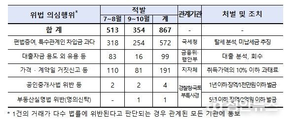 이번 기획조사는 대출규제 강화, 토지거래허가구역 확대 등 시장 안정화 대책이 본격적으로 실행됨에 따라, 편법 대출·증여나 토지거래허가 위반 등 시장질서를 교란하는 이상거래가 확대될 우려에 대비하여 서울 및 경기 일부지역(6곳)에 한정했던 ’25.1월~6월 조사와 달리 해당 지역 외에 경기 9곳을 추가 확대하여 ‘25.7월 ~ 10월 거래 신고분에 대해 실시했으며,이상거래 총 2,255건을 조사하여 위법 의심거래 746건(위법의심행위 867건)을 적발했다.