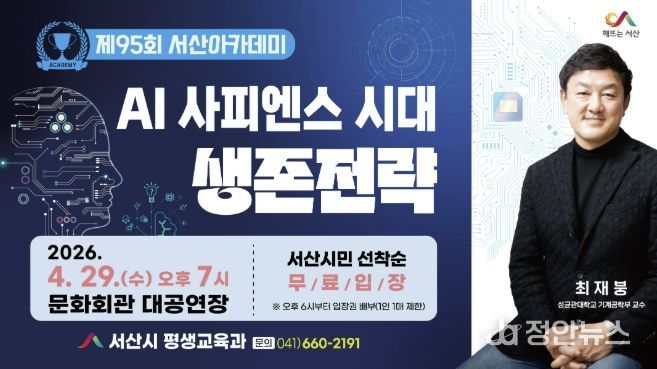 정안뉴스 안정주 기자 | 충남 서산시는 성균관대학교 최재붕 교수를 초청해 오는 4월 29일 오후 7시 서산문화회관 대공연장에서 제95회 서산아카데미를 개최한다고 밝혔다.