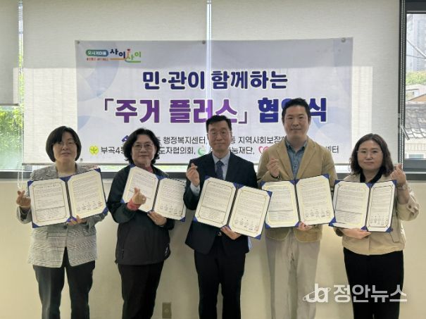 정안뉴스 안정주 기자 | 부산 금정구 부곡4동은 지난 4월 21일 세정나눔재단, 금정구 자원봉사센터, 부곡4동 지역사회보장협의체, 부곡4동 새마을지도자협의회와 함께 『민관협력 주거 플러스』 사업 추진을 위한 업무협약을 체결했다.