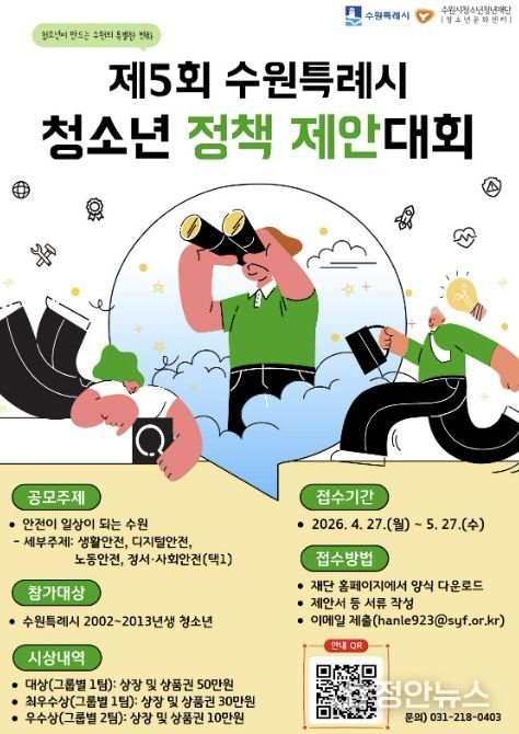 정안뉴스 안정주 기자 | 수원시청소년청년재단 수원청소년문화센터는 청소년이 정책을 기획하고 제안하는 ‘제5회 수원특례시 청소년 정책 제안대회’ 참가팀을 4월 27일부터 5월 27일까지 모집한다.