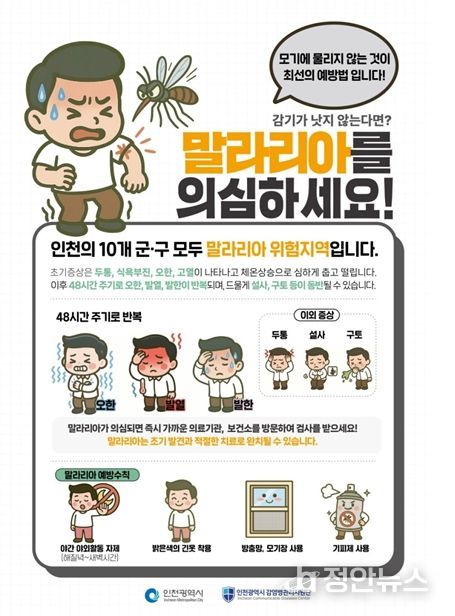 정안뉴스 안정주 기자 | 인천광역시는 오는 4월 25일 ‘세계 말라리아의 날’을 맞아 본격적인 모기 활동 시기에 대비해 시민들에게 국내 말라리아 감염 예방과 조기 검사의 중요성을 당부했다.