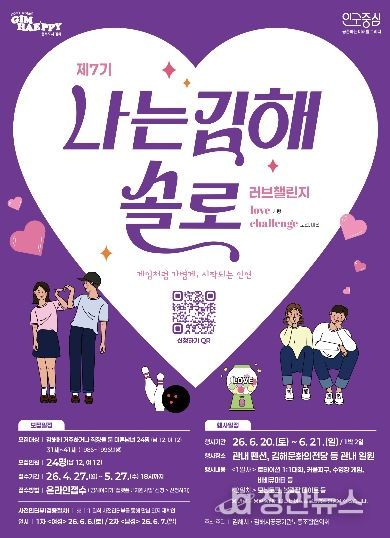 정안뉴스 김재홍 기자 | 김해시는 오는 6월 20일부터 21일까지 1박 2일 일정으로 관내 펜션과 김해문화의전당 등에서 진행하는‘제7기 나는 김해솔로-러브챌린지’참가자 24명(남·여 각 12명)을 모집한다고 24일 밝혔다.