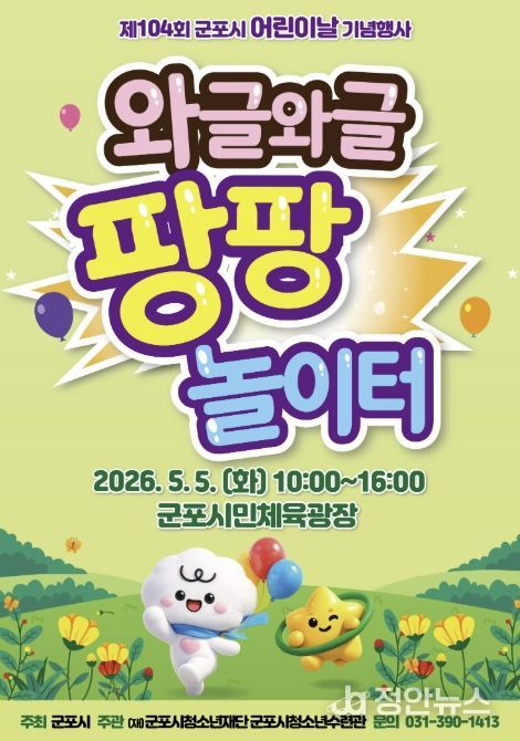 정안뉴스 안정주 기자 | 군포시는 제104회 어린이날을 맞아 오는 5월 5일 오전 10시부터 오후 4시까지 군포시민체육광장에서 ‘와글와글 팡팡 놀이터’를 주제로 어린이날 기념행사를 개최한다.