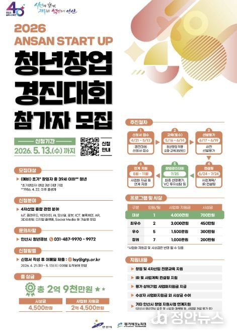 정안뉴스 안정주 기자 | 안산시는 창의적인 아이디어를 보유한 청년 창업가를 발굴하기 위해 내달 13일까지 ‘2026 안산 스타트업 청년창업 경진대회’ 참가자를 모집한다고 24일 밝혔다.