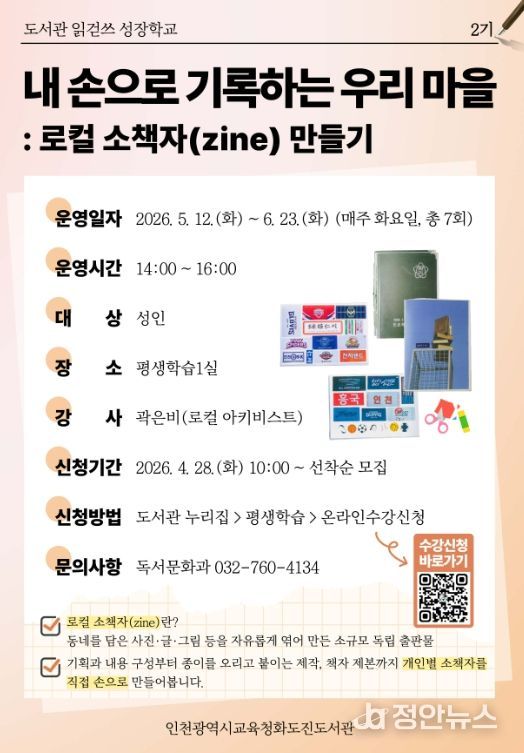 정안뉴스 안정주 기자 | 인천광역시교육청화도진도서관은 오는 28일부터 지역의 일상을 기록으로 담아내고 공유하는 시민 참여형 프로그램 ‘내 손으로 기록하는 우리 마을’의 참여자를 모집한다.