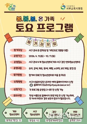 정안뉴스 안정주 기자 | 인천서부교육지원청은 4월 11일부터 10월 17일까지 ‘2026 서부 방과후·돌봄 지역연계(봄봄봄) 온 가족 토요 프로그램’을 운영한다.