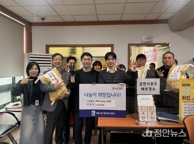 정안뉴스 안정주 기자 | 수원시 권선구 소재 수성교회는 세류3동행정복지센터에 쌀 50포를 기부하며, 지역 내 어려운 이웃을 위한 따뜻한 나눔을 실천했다.