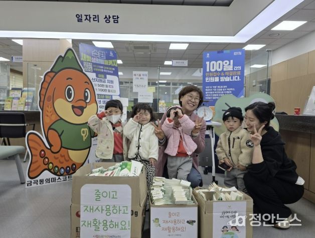 정안뉴스 안정주 기자 | 수원시 권선구 금곡동 행정복지센터는 지난 22일 오전 10시, 행정복지센터 민원실에서 시립수원가온어린이집 원생 10여 명이 참여한 ‘금곡이가 알려주는 재활용 놀이터’ 체험 행사를 진행했다고 밝혔다.