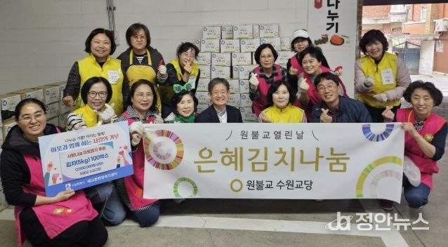 정안뉴스 안정주 기자 | 수원시 팔달구 매교동은 지난 22일, 원불교 수원교당(교구장 김도천)으로부터 직접 담근 배추김치(5kg) 100박스를 기부받았다고 밝혔다.