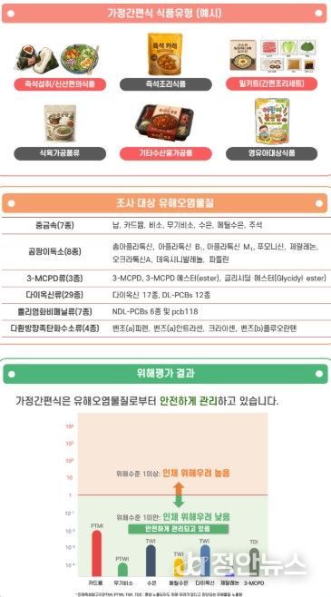 정안뉴스 안정주 기자 | 식품의약품안전처는 최근 수요가 급증한 밀키트, 샐러드, 즉석밥 등 가정간편식에 대해 중금속 등 유해오염물질 오염 수준을 조사하고, 국내 최초로 위해평가를 실시한 결과 제품 모두 안전한 수준이 확인됐다고 밝혔다.
