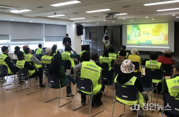 정안뉴스 안정주 기자 | 수원시 장안구는 지난 4월 23일, 장안구청 대회의실에서 자원관리사들을 대상으로 안전 및 직무 교육을 실시했다.