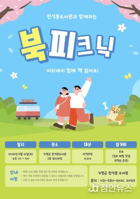 정안뉴스 안정주 기자 | 가평군은 5월 가정의 달을 맞아 오는 16일 한석봉도서관 3층 담소마당에서 ‘가족과 함께하는 북 피크닉’ 행사를 개최한다고 밝혔다.