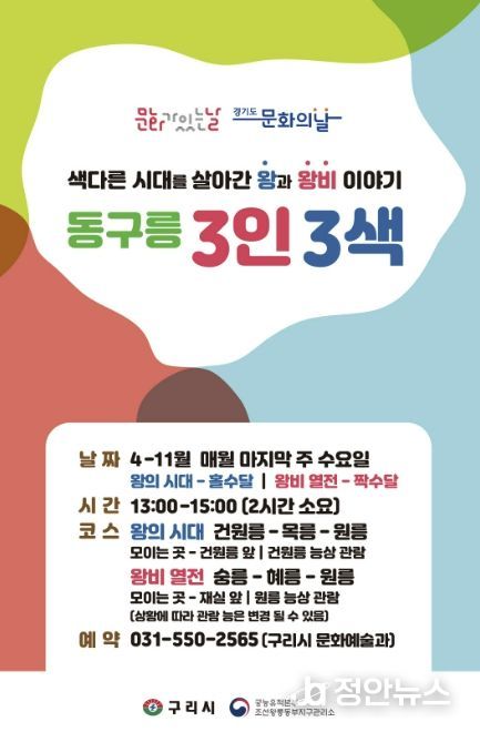 구리시 관계자는 “문화가 있는 날을 맞아 세계유산 동구릉에서 조선의 다양한 시대와 왕·왕비의 이야기를 만나는 뜻깊은 시간이 되길 바란다”라며 “앞으로도 시민들이 역사와 문화를 가까이에서 체험할 수 있는 프로그램을 지속적으로 확대해 나가겠다”라고 밝혔다.