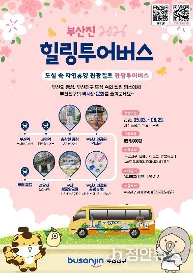 정안뉴스 안정주 기자 | 부산진구는 도심 속 자연휴양 관광벨트 사업의 일환으로 부산진구의 주요 관광지와 자연휴양 자원을 연계한 ‘부산진 힐링투어버스’를 5월부터 9월 말까지 운영한다고 밝혔다.