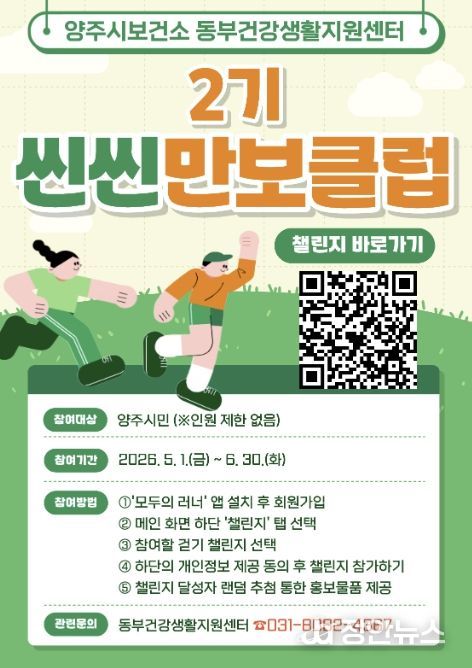 정안뉴스 안정주 기자 | 양주시보건소 동부 건강생활지원센터에서 지역 주민의 건강생활실천율 향상과 비만율 개선을 위해 ‘2026년도 씬씬 만보클럽 2기’ 참여자를 모집한다.