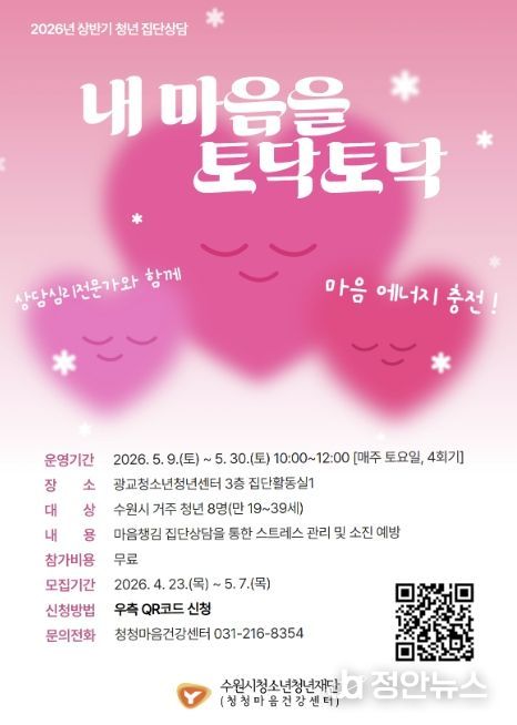 정안뉴스 안정주 기자 | 수원시청소년청년재단 청청마음건강센터는 학업과 취업준비, 직장생활 등 경쟁 중심 환경으로 인해 심리적 소진을 겪는 관내 청년들을 대상으로, 오는 5월 7일까지 전문가가 참여하는 집단상담 프로그램 ‘내 마음을 토닥토닥’ 참가자를 모집한다고 밝혔다.