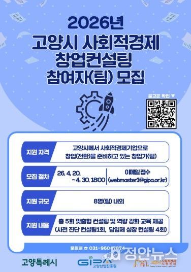 정안뉴스 안정주 기자 | 고양산업진흥원이 운영하는 고양시사회적경제지원센터가‘2026년 고양시 사회적경제 창업컨설팅 사업’에 참여할 예비 창업자(팀)을 오는 30일까지 모집한다.