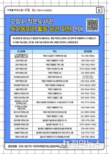 고양시 관계자는 “이번 공간 지원 사업이 독서동아리의 활동 기반을 넓히고, 작은도서관이 지역사회 내 커뮤니티 공간으로서 기능을 강화하는 계기가 되길 바란다”며, “앞으로도 시민들이 ‘함께 읽는 독서 문화’를 누릴 수 있도록 지원하겠다”고 말했다.
