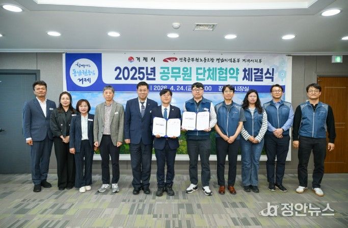 거제시와 전국공무원노동조합 거제시지부는 24일 거제시청 시장실에서 2025년 공무원 단체협약을 체결했다.