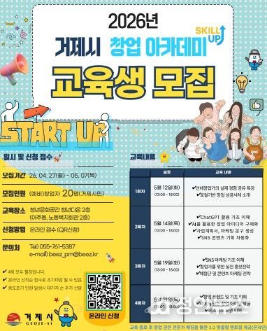 정안뉴스 김재홍 기자 | 거제시는 지역 내 예비 창업자와 일반 시민이 일상 속 아이디어를 창업 으로 구현해볼 수 있도록 돕는'2026년 거제시 창업 아카데미' 교육생을 오는 4월 27일부터 모집한다.