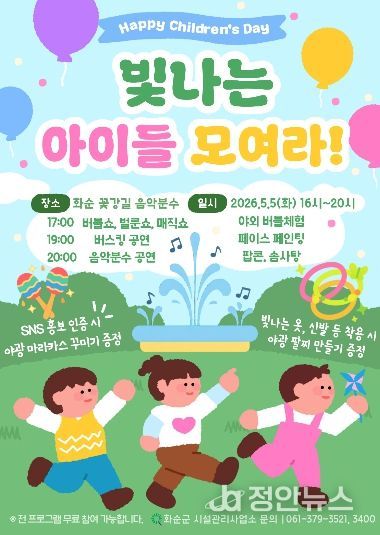 정안뉴스 안정주 기자 | 화순군은 오는 5월 5일 오후 4시부터 밤 8시까지 꽃강길 음악분수대에서 어린이날 특별 행사 ‘빛나는 아이들 모여라’를 개최한다고 밝혔다.