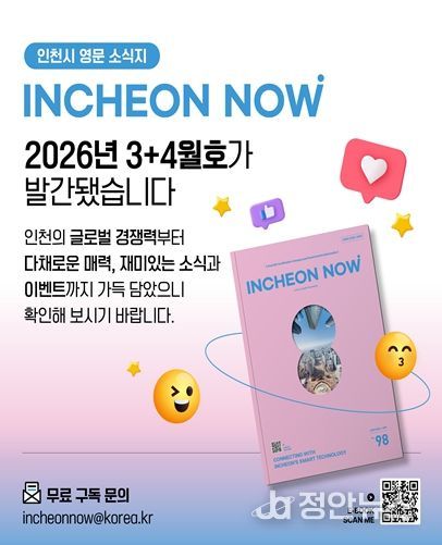 정안뉴스 안정주 기자 | 인천광역시는 도시의 혁신적인 정책과 차별화된 매력을 전 세계에 소개하는 영문소식지 '인천나우(Incheon Now)' 3·4월호(Vol. 98)를 발간했다고 밝혔다.