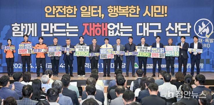 정안뉴스 안정주 기자 | 대구광역시는 최근 잇따른 산업단지 내 화재와 폭발 사고로부터 시민의 소중한 생명과 재산을 보호하기 위해 4월 24일 오후 2시, 시청 산격청사 대강당에서 ‘산업단지 재해예방 안전실천 선포식’을 개최했다.