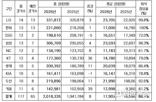 정안뉴스 안정주 기자 | 2026 신한 SOL KBO 리그가 오늘(25일) 열린 잠실, 문학, 광주, 고척, 대전 경기에서 총 9만 9,905명이 입장하며 200만 관중을 달성했다.