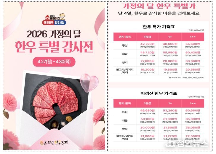 정안뉴스 안정주 기자 | 농림축산식품부는 가정의 달을 맞아 한우자조금, 전국한우협회, 농협경제지주와 협력하여 4월 27일부터 5월 10일까지 14일 동안 농축협 하나로마트, 대형마트 및 주요 온라인몰 등에서 ‘소(牛)프라이즈 대한민국 한우고기 할인행사’를 실시한다고 밝혔다.
