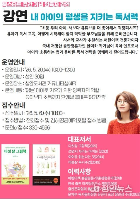 정안뉴스 김재홍 기자 | 김해시 칠암도서관은 북스타트 주간을 맞아 올바른 독서 양육의 방향을 제시하기 위해 내달 20일 ‘내 아이의 평생을 지키는 독서력’ 강연을 개최한다고 27일 밝혔다.