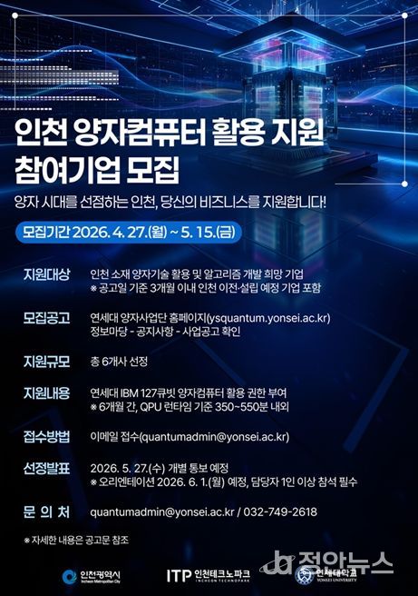 시는 연세대학교와 협력해 ‘2026년 인천 양자컴퓨터 활용 지원사업’에 참여할 기업을 모집한다.