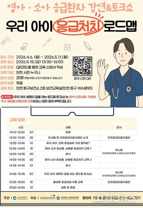 정안뉴스 안정주 기자 | 인천광역시는 영유아와 소아의 응급상황 발생 시 보호자의 신속하고 올바른 대응을 돕기 위해 응급처치 강연·토크쇼 ‘우리아이 응급처치 로드맵’을 오는 5월부터 12월까지 운영한다고 밝혔다.