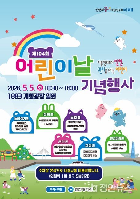 정안뉴스 안정주 기자 | 인천광역시는 제104회 어린이날을 맞아 어린이의 권리 존중과 참여 확대를 위한 기념행사를 오는 5월 5일 오전 10시 30분부터 오후 4시까지 중구 북성동 ‘1883 개항광장 일원’에서 개최한다고 밝혔다.