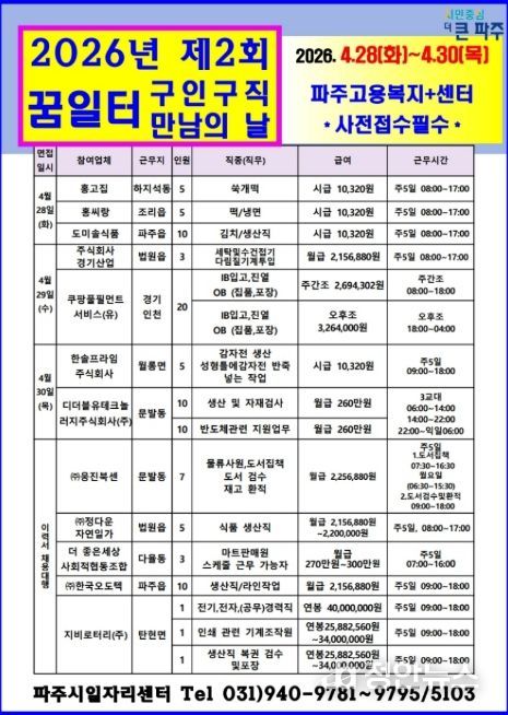 정안뉴스 안정주 기자 | 파주시는 오는 28일부터 30일까지 파주고용복지플러스센터(금촌동 엠에이치(MH)타워 8층)에서 2026년 제2회 ‘구인·구직 만남의 날’을 개최한다.