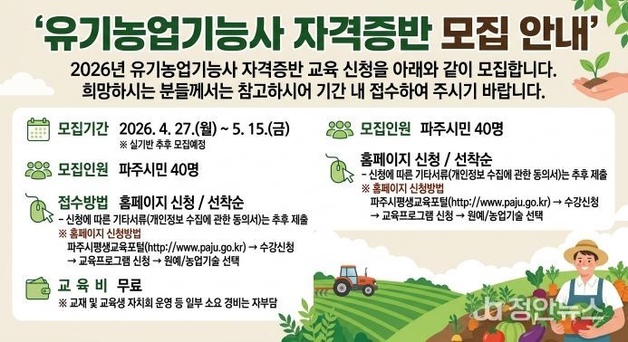 정안뉴스 안정주 기자 | 파주시농업기술센터는 친환경농업 분야 농업 전문 인력 육성을 위한 '2026년 유기농업기능사 자격증 취득’교육생을 4월 27일부터 5월 15일까지 모집한다.
