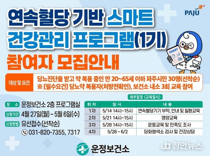 정안뉴스 안정주 기자 | 파주시 운정보건소는 심뇌혈관질환 예방관리사업의 일환으로 ‘연속혈당 기반 스마트 건강관리 프로그램’참여자를 오는 27일부터 10일간 모집한다.