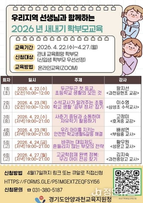 정안뉴스 안정주 기자 | 경기도안양과천교육지원청은 오는 4월 22부터 27일까지 관내 신입생 학부모를 대상으로 ‘우리지역 선생님과 함께하는 2026년 새내기 학부모 교육’을 개최한다.