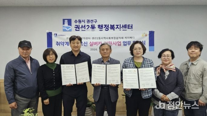 정안뉴스 안정주 기자 | 수원시 권선구 권선2동은 지난 23일, 권선2동 지역사회보장협의체, 케이메디와 취약계층 어르신의 안전한 이동 지원과 삶의 질 향상을 위한 “실버카(보행보조기) 지원사업 업무협약(MOU)”을 체결했다.